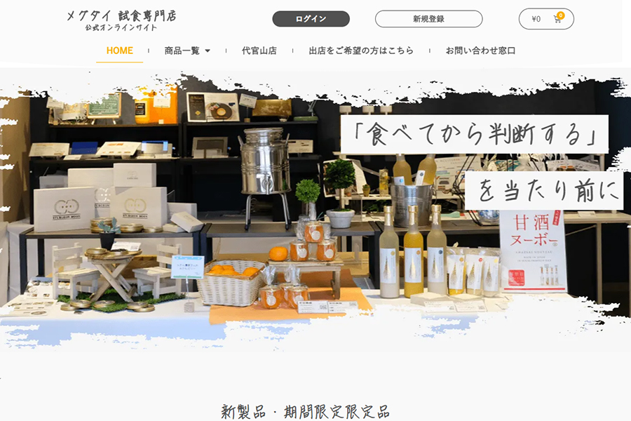 「試食専門店メグダイ」は、生産者が試食をしてもらうという広告手段の場として設立した「完全無料で、味に自信のある生産者の最高級品の商品を試食できる」店舗です。