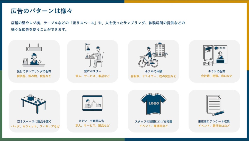 壁だけではなくて、会計時に商品のサンプルを渡してもらったり、空きスペースに商品を置いて触ってもらったり、スタッフさんの制服にロゴを掲載してもらったり、美容室で実際に消費者に試してもらったりなど、より広告主側としてはターゲットに広告できる様に様々なアプローチを物理的にしてもらうことができるんです。
